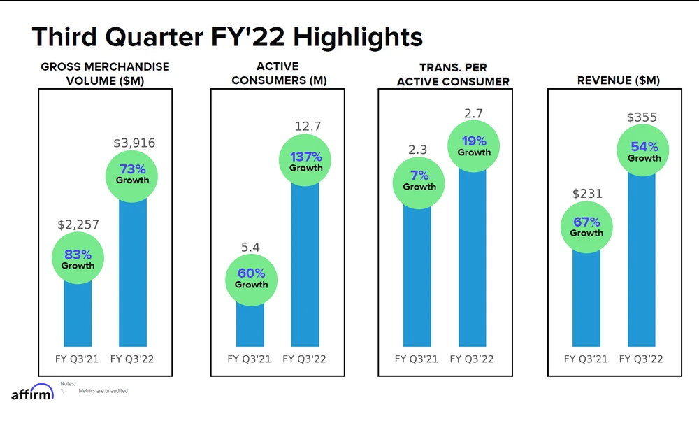 "Wir liefern weiterhin ein starkes Wachstum und skalieren schnell unser Netzwerk. Die Zahl der aktiven Händler auf unserer Plattform stieg im Jahresvergleich von 12.000 auf 207.000, und die Zahl der aktiven Verbraucher stieg um 137 Prozent auf 12,7 Millionen Menschen", sagte Max Levchin, Gründer und CEO von Affirm.