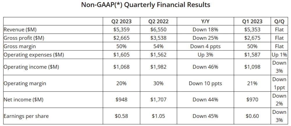 AMD hat im zweiten Quartal einen Umsatzeinbruch von 18 Prozent auf 5,36 Milliarden Dollar verkraften müssen. Immerhin konnte der Chip-Hersteller die Umsatzschätzungen der Analysten von 5,32 Milliarden Dollar übertreffen. Die Experten hatten aufgrund des Crashs am PC- und Notebookmarkt bereits mit entsprechenden Rückgängen gerechnet.