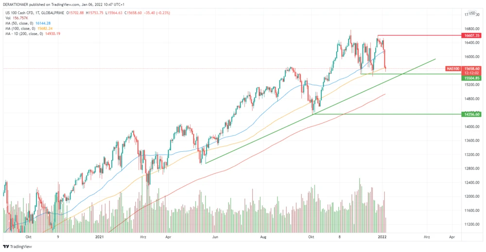Allerdings zeigt der Blick auf die Entwicklung der vergangenen Wochen klare Schwächen im Chart auf und die 50-Tage-Linie wurde mit dem gestrigen Abverkauf erneut durchbrochen. Gehen die Abverkäufe am Donnerstag weiter, worauf die leicht schwächeren Nasdaq-100-Futures hindeuten, rückt zudem die horizontale Unterstützung bei 15.500 Punkten in den Blick. Erst bei 14.880 Punkten liegt dann die 200-Tage-Linie, die seit dem Ausbruch der Pandemie nicht mehr getestet wurde.