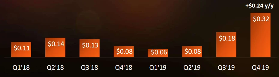 AMD erwirtschaftete im vierten Quartal einen Gewinn von 0,32 Dollar bei einem Umsatz von 2,13 Milliarden. Damit hat der Chip-Hersteller die Erwartungen der Analysten von einem Gewinn von 0,31 Dollar bei einem Umsatz von 2,11 Milliarden Dollar übertroffen.