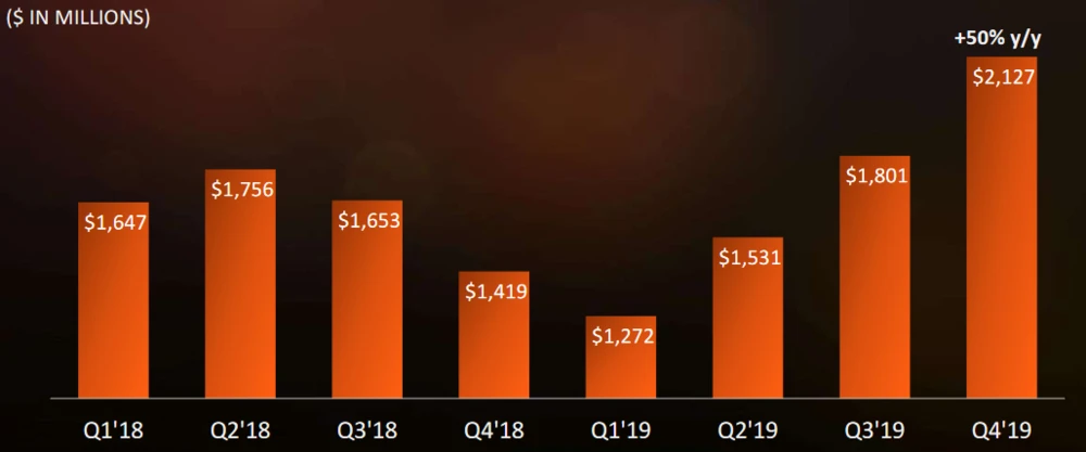 Mit den neuen Ryzen-Mobile-Chips und einem Refresh des Navi-GPU-Portfolios startet AMD erneut stark ins neue Jahr und prognostiziert einen Umsatz im ersten Quartal 2020 um 1,8 Milliarden Dollar. Das würde ein Umsatzwachstum von 42 Prozent gegenüber dem Vorjahr bedeuten. Analysten erwarten mit 1,86 Milliarden Dollar etwas mehr.