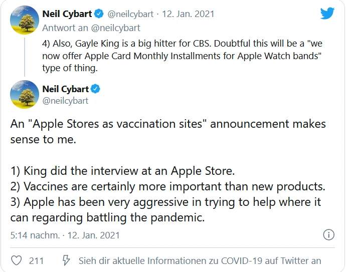 In den Medien wird bereits spekuliert, ob es morgen möglicherweise um Datenschutzthemen oder die Freigabe der finalen Version von iOS 14.4 gehen könnte. Analyst Neil Cybart nimmt jedoch an, dass Apple morgen seine Stores als Impfstellen für Covid-19-Impfungen zur Verfügung stellen möchte. Unter anderem weil Gayle King das Interview mit Cook in einem örtlichen Apple Store geführt habe.