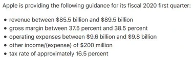 Für das laufende erste Quartal 2020 prognostizierte Apple am Mittwoch einen Umsatz-Zuwachs auf 85,5 bis 89,5 Milliarden Dollar. Angesichts der Erwartungen der Analysten von 63,0 Milliarden Dollar ist die Prognosespanne vielversprechend. Im Vorjahresquartal hatte ein Einbruch im China-Geschäft noch für einen Rückgang auf 84,3 Milliarden Dollar gesorgt.