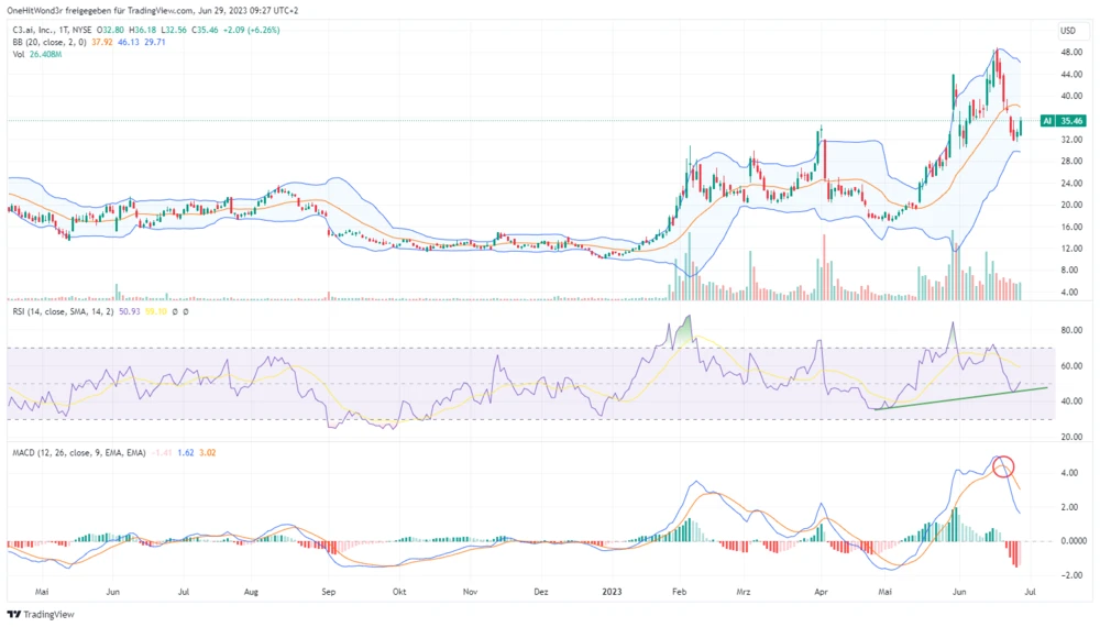 In den vergangenen zwei Tagen gelang den Bullen ein erster Gegenschlag. Mitentscheidend dürfte gewesen sein, dass der Technologieindex Nasdaq 100 seine Verlustserie beenden konnte. Ausgehend vom jüngsten Korrekturtief bei 31,57 Dollar hat C3.ai bereits 12 Prozent wiedergutmachen können. Was die weiteren Aussichten anbelangt, zeigt sich das Chartbild aber disparat: