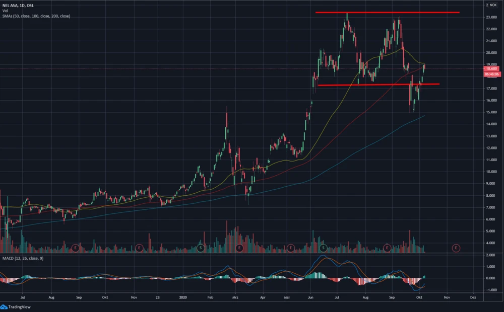 Nachdem der Partner Nikola mit möglichen Betrugsvorwürfen Negativ-Schlagzeilen machte, geriet auch die Nel-Aktie unter Druck. Der Wert fiel dabei aus dem Seitwärtskanal, der zwischen 17,40 und 23,40 Norwegische Kronen (17,40 NOK entsprechen 1,59 Euro) verläuft. An der 15-NOK-Marke kam es aber zum Rebound und der Kurs kehrte am vergangenen Donnerstag in die Range zurück.
