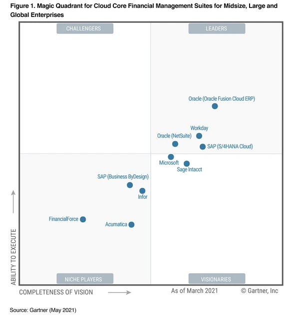 Da wo Microsoft noch kein Marktführer ist, ist der Konzern auf dem besten Wege bald einer zu werden. Beispielsweise im Bereich der Finanz- und Buchhaltungssoftware. Hier hat das Redmonder Unternehmen mit Microsoft Dynamics eine ernsthafte Konkurrenzlösung zu SAP und Oracle entwickelt. Aktuell wird Microsoft in diesem Feld von Gartner als "Visionary" (zu Deutsch: Visionär) angesehen (siehe Bild unten).