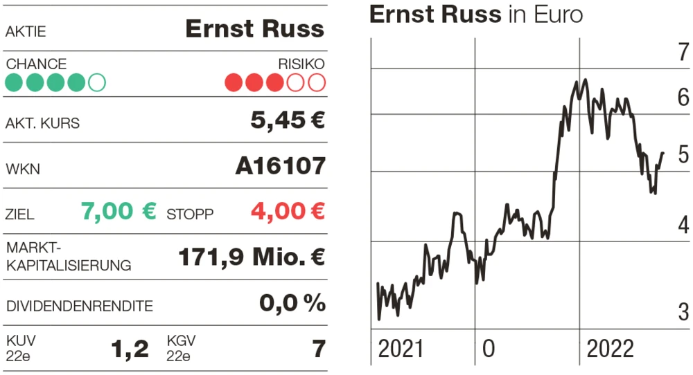 Die Aktien von Hapag Lloyd und ZIM Integrated Shipping haben es vorgemacht, sie notieren auf Rekordhoch. Die Papiere von Ernst Russ dürften den Anker ebenfalls bald lichten. Auch wenn die Auswirkungen des Krieges auf die Weltwirtschaft nicht verlässlich absehbar sind: Die Charter-Raten der Reederei dürften auch in den kommenden Monaten auf hohem Niveau liegen. Coronabedingte Schließungen von chinesischen Häfen könnten die Preise kurzfristig weiter in die Höhe treiben.