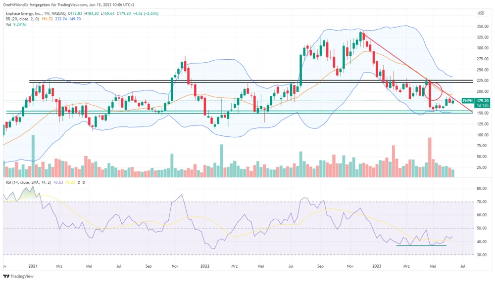 Nach einem mehrwöchigen Bodenbildungsversuch zwischen Februar und April versuchte sich Enphase an einem Ausbruch über den Horizontalwiderstand bei 225 Dollar, scheiterte aber nach dem mit Entsetzen zur Kenntnis genommenen Quartalsbericht. Seither arbeitet die Aktie an einem neuen Bodenbildungsversuch, Anlaufstelle für diesen war die mehrjährige Supportzone zwischen 150 und 155 Dollar.