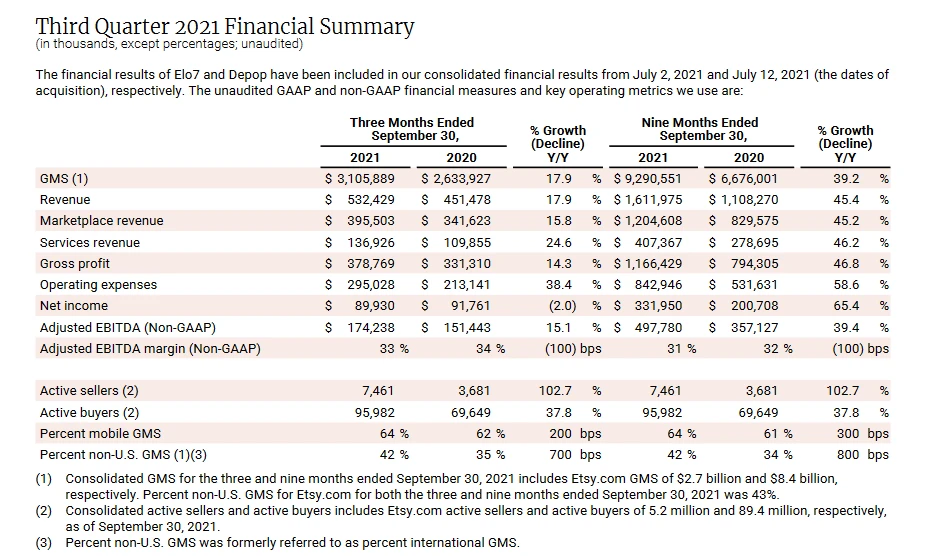 Insgesamt kann die beliebte Plattform für Handgemachtes auf ein solides drittes Quartal zurückblicken. Sowohl das Bruttowarenvolumen (3,1 Milliarden Dollar) als auch der Umsatz legten im Q3 im Vorjahresvergleich um knapp 18 Prozent (532,4 Millionen Dollar) zu. Damit haben die US-Amerikaner sowohl die Analystenerwartungen (519 Millionen Dollar) als auch die eigene Prognose übertroffen.