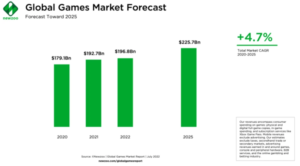 Die Marktforscher von Newzoo erwarten laut ihrem im Juli aktualisierten Report in den kommenden Jahren auch wieder ein anziehendes Wachstum auf dem weltweiten Gaming-Markt. Ausgehend von 197 Milliarden Dollar im Jahr 2022 soll der Gesamtmarkt bis 2025 rund 226 Milliarden Dollar umfassen. Insbesondere der Mobile-Markt soll dabei zum Wachstum beitragen.