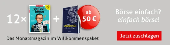 Es lohnt sich, einfach börse regelmäßig zu lesen und Börsenwissen Schritt für Schritt zu erweitern. Dafür bietet sich ein Jahresabonnement im einfach börse-Willkommenspaket an. Damit erhalten Sie 12 Ausgaben des Magazins plus ein Buchgeschenk „Das Geheimnis erfolgreicher Anleger“, in dem Sie erfahren, mit welcher Strategie Sie langfristig Vermögen aufbauen.