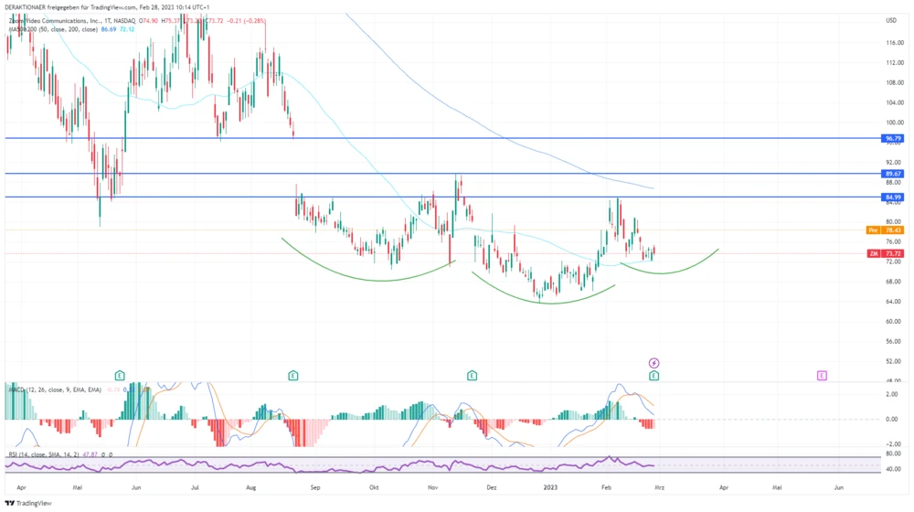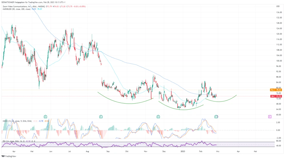 Zoom gab am Montagabend seine Zahlen für das vierte Quartal bekannt und übertraf die Analysteneinschätzungen deutlich (ausführlicher Bericht hier). Das technische Bild hellt sich durch den nachbörslichen Kurssprung um etwa acht Prozent spürbar auf.