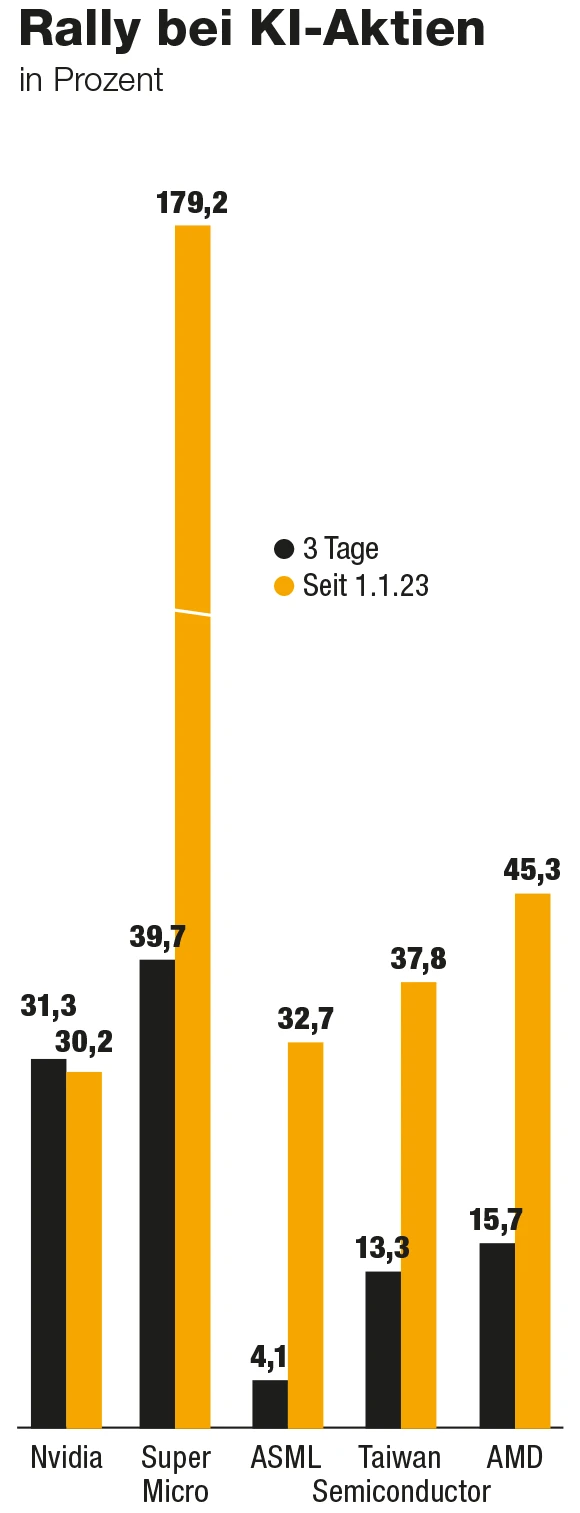 Im Sog von Nvidia zogen etliche andere Branchenplayer ebenfalls stark im Kurs an. Die Aktie von Super Micro Computer etwa kletterte in der Spitze auf 243 Dollar, bevor Gewinnmitnahmen den Titel auf 234 Dollar nachgeben ließen. Selbst auf dem niedrigeren Niveau beträgt das Plus des AKTIONÄR-Tipps, der Mitte April ins Aktiendepot gekauft wurde, noch rund 100 Prozent.