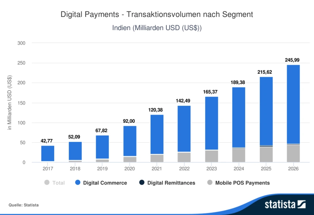 Laut einer Prognose von Statista wird im Jahr 2026 in Indien ein Gesamttransaktionsvolumen von rund 246 Milliarden Dollar erreicht. Ausgehend von rund 142 Milliarden Dollar im Jahr 2022 würde dies einem jährlichen erwarteten durchschnittlichen Wachstum von 14,6 Prozent entsprechen.