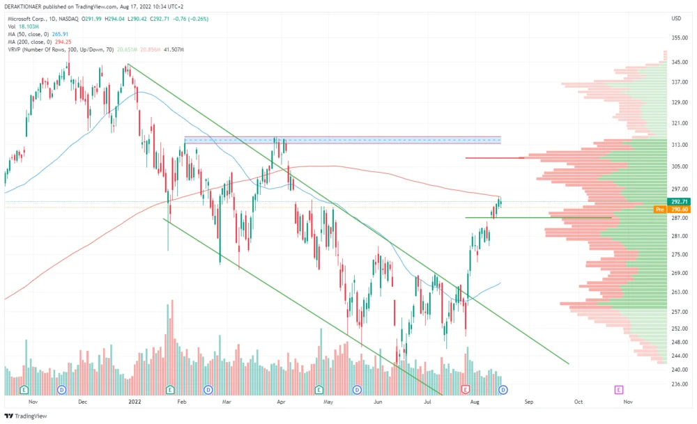 Seit dem Ausbruch über den Abwärtskanal geht es bei der Microsoft-Aktie rund. Infolge der Quartalszahlen Ende Juli sprang sie über die Kanalbegrenzung bei 262 Dollar und generierte damit ein starkes technisches Kaufsignal. Die vom AKTIONÄR anvisierten kurzfristigen Kursziele am Volume-Peak bei 288 Dollar sowie dem GD200 bei momentan 294 Dollar wurden daraufhin erreicht.