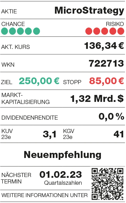 MicroStrategy geht mit der Bitcoinstrategie volles Risiko, dürfte bei einem Comeback der Digitalwährung aber auch überdurchschnittlich stark profitieren. Sehr risikofreudige Anleger stellen schon jetzt einen ersten Fuß in die Tür, alle anderen setzen die Aktie auf die Watchlist.