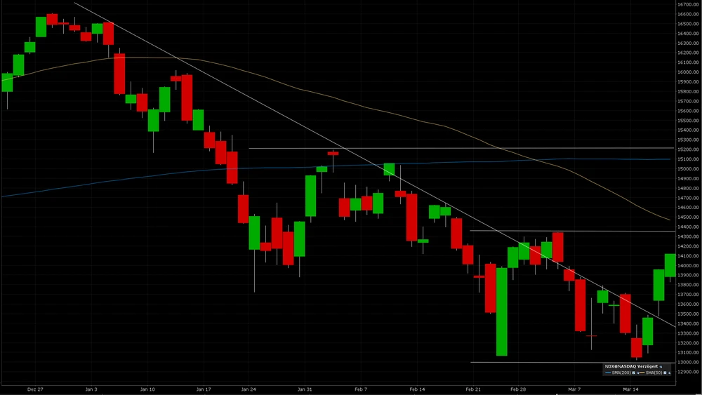 Am Mittwoch wurde dann ein wichtiges Kaufsignal ausgelöst. Der Abwärtstrend, der sich seit Jahresanfang ausgebildet hatte, wurde durchbrochen. Gestern setzte sich diese Erholungsbewegung dann fort: Der Nasdaq 100 legte um über ein Prozent zu und durchbrach die 14.000-Punkte-Marke. Damit kommt der Index seit Montag bereits auf ein Plus von acht Prozent.