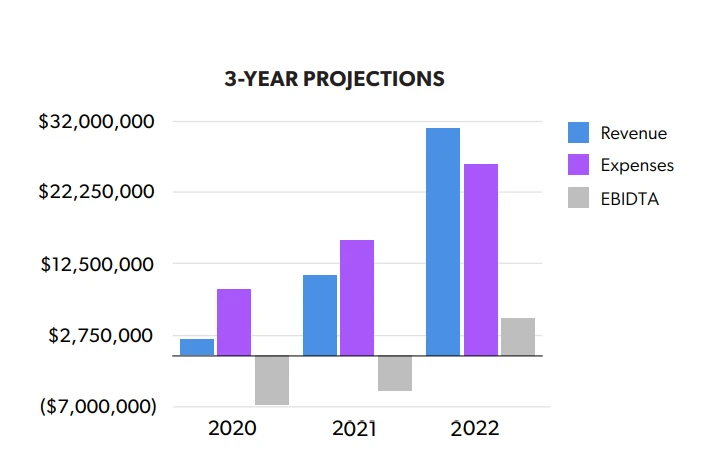 Der Unternehmenshomepage zufolge hat sich NetCents einiges für die nächsten beiden Jahre vorgenommen: Beispielsweise sollen die Umsatzerlöse 2022 fast 32 Millionen Dollar betragen, bei einem EBITDA von mehr als 2,75 Millionen Dollar. Zum Vergleich: Für 2020 peilt der Krypto-Finanzdienstleister Umsätze unter 2,75 Millionen Dollar an, bei einem negativen EBITDA von fast sieben Millionen Dollar. Demnach rechnet das Unternehmen mit einem Umsatzanstieg von über 1.000 Prozent binnen zwei Jahren (Siehe Grafik unten).