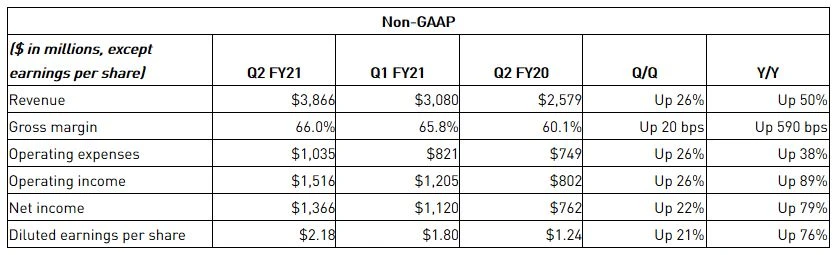 Nvidia hat im zweiten Quartal einen Umsatzzuwachs von 50 Prozent gegenüber dem Vorjahresquartal auf 3,87 Milliarden Dollar erzielt. Steigende Kosten drückten jedoch auf die Gewinnmargen. Der Gewinn je Aktie legte nur 10 Prozent auf 2,18 Dollar je Aktie zu.