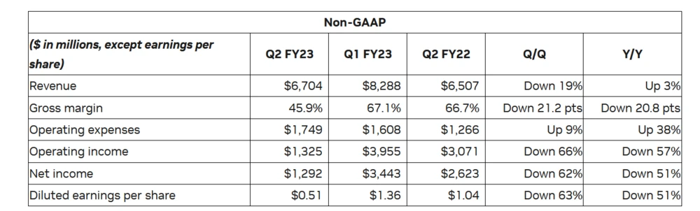Nvidia erwirtschaftete im zweiten Quartal (bis Ende Juli) einen Umsatz von 6,70 Milliarden Dollar bei einem bereinigten Gewinn je Aktie von 0,51 Dollar. Der nur um drei Prozent gegenüber dem Vorjahr gestiegene Umsatz entsprach den vorläufigen Daten von Anfang August. Beim Gewinn je Aktie, der zuvor nicht kommuniziert wurde, lag der Chip-Konzern leicht unter den Erwartungen der Analysten von 0,53 Dollar.