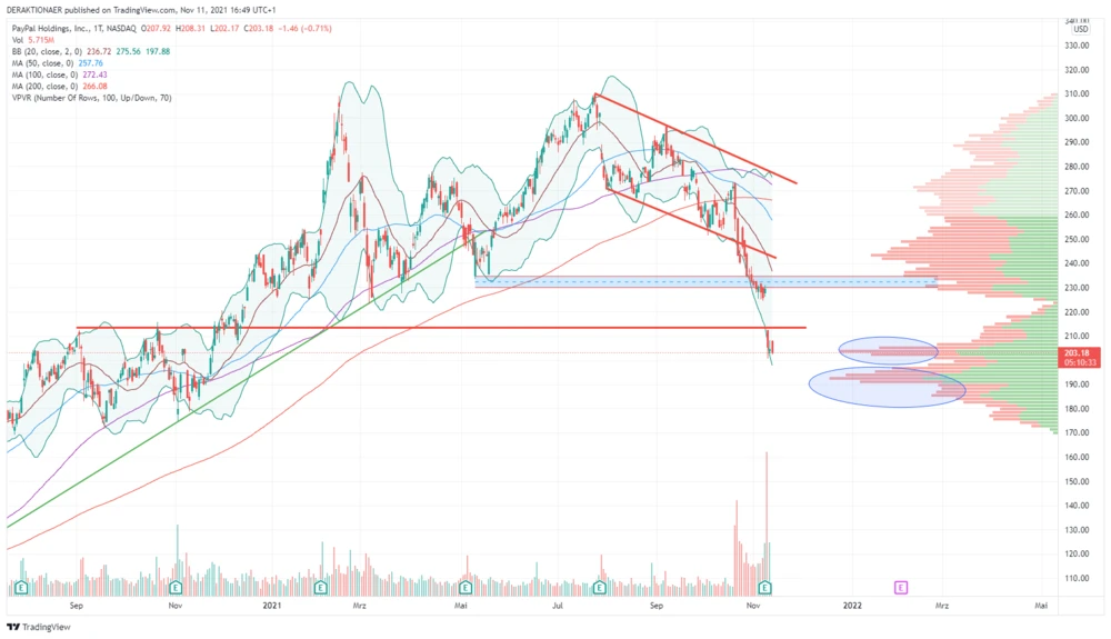Ausgehend vom Allzeithoch am 26. Juli bei 310,16 Dollar konsolidierte die Paypal-Aktie in Form eines abfallenden Kanals. Ende Oktober spitzte sich die Lage zu, als sie unter den Kanal bei 248 Dollar rutschte und damit ein Verkaufssignal generierte. Zwar konnte die Unterstützungszone zwischen 230 und 255 Dollar kurzzeitig Halt bieten. Doch im Nachgang der Zahlen fiel der Titel auch unter diesen Support und durchbrach zudem die Horizontale bei 212,45 Dollar.