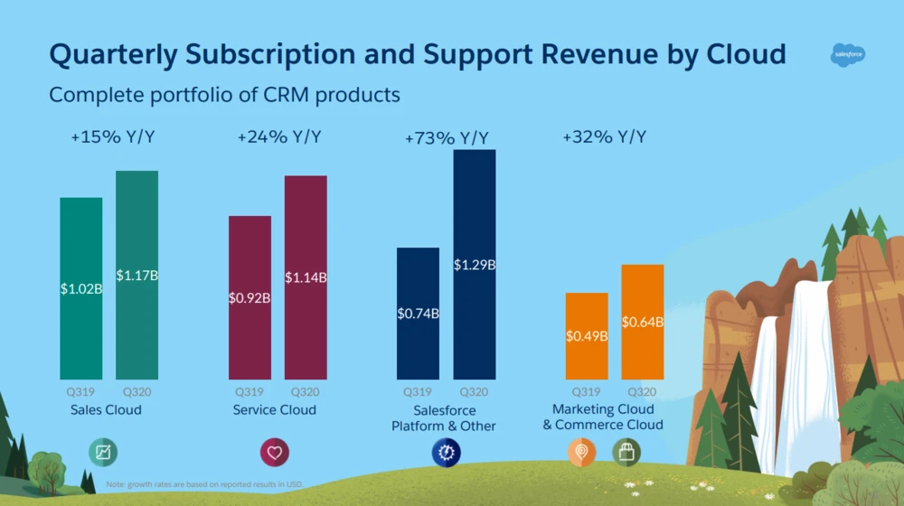 Größter Wachstumstreiber war in diesem Quartal der größte Geschäftsbereich "Subscription and Support". Hier wurde ein Umsatz von 4,24 Milliarden Dollar erzielt (plus 34 Prozent zum Vorjahr). Das Flagschiff-Produkt Sales Cloud erlöste dabei rund 1,17 Milliarden Dollar. Der Bereich "Professional Services" steuerte rund 274 Millionen Dollar zum Ergebnis bei.