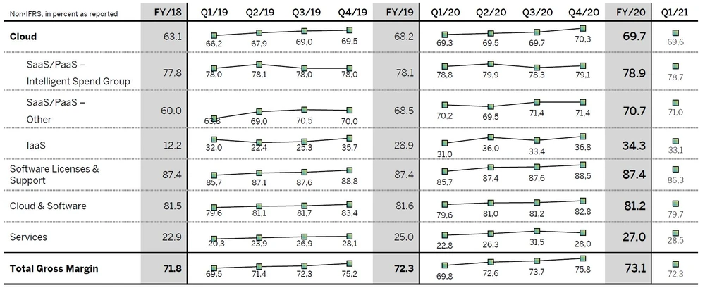 Denn obwohl die mittelfristigen Ziele zusammengestrichen wurden, hat sich die positive Entwicklung der Bruttomarge von 2018 bis heute fortgesetzt. Insbesondere im wichtigen Wachstumsbereich, der Cloud, ist deutlich eine Verbesserung der Margen festzustellen.