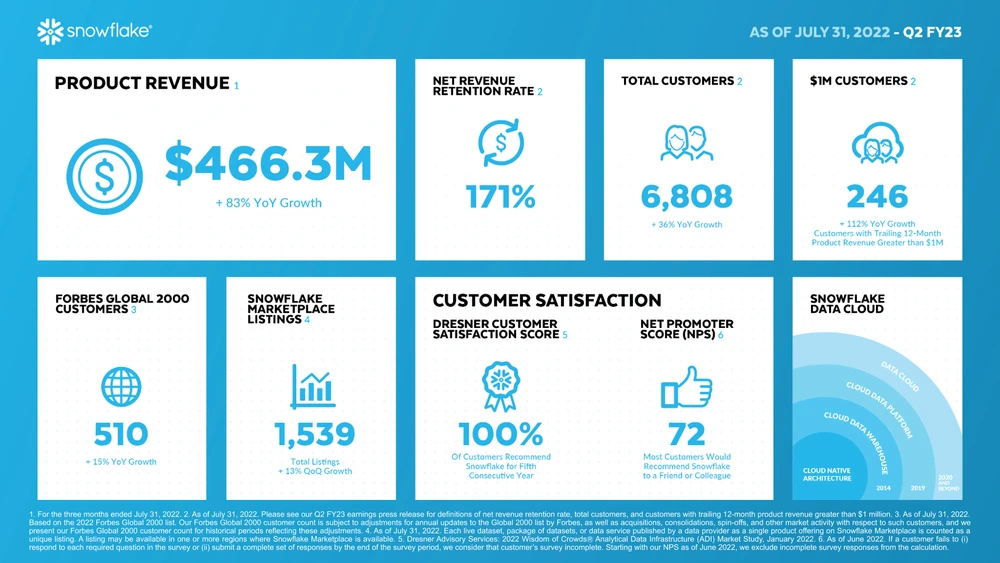 Snowflake steigerte seine Produkt-Einnahmen im zweiten Geschäftsquartal gegenüber dem Vorjahr um 83 Prozent auf rund 466 Millionen Dollar. Erwartet wurden lediglich 438 Millionen Dollar. Die verbleibenden Leistungsverpflichtungen lagen bei 2,7 Milliarden Dollar und damit 78 Prozent über dem Vorjahreswert.