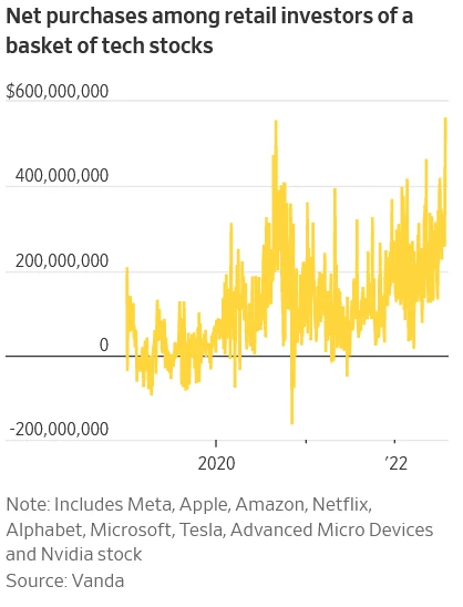 Denn laut den Daten von Vanda Research haben Privat- und Kleinanleger wieder verstärkt bei ihren Lieblingsaktien zugegriffen – also bei den Aktien von Alphabet, Amazon, AMD, Apple, Microsoft, Netflix, Nvidia und Tesla. Ein Korb aus diesen Papieren hat im späten Juli Nettokäufe in einer Höhe erzielt, wie sie zuletzt im Jahr 2014 beobachtet wurden.