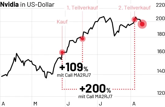 DER AKTIONÄR-Chefredakteur Leon Müller und sein Team erkannten das erneute Kurspotenzial beim Tech-Riesen: Mit einer ihrer ersten Transaktionen im Optionsscheindienst-Depot setzen sie mit dem idealen Hebel auf steigende Kurse bei Nvidia. So konnten die Leser des Börsendienstes in nur 12 Wochen ein überragendes Plus von 200 Prozent realisieren – und das Ende der Erfolgsstory ist beim Tech-Giganten noch lange nicht in Sicht.