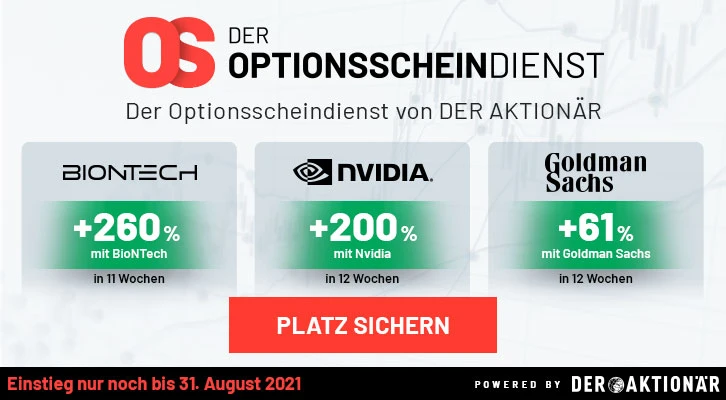 Sie sind überzeugt? Dann handeln Sie jetzt – denn Der Optionsscheindienst öffnet nur noch bis zum 31. August 2021 exklusiv seine Tore für Neueinsteiger. Danach wird die Jagd nach dreistelligen Renditen fortgesetzt. Holen Sie mit dem Optionsscheindienst alles raus, was geht.