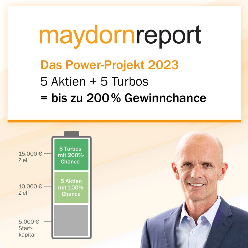 Um mit dabei zu sein, einfach beim maydornreport einsteigen. Darin finden Sie das Power-Projekt mit allen 5 Aktien sowie die Turbo-Variante mit den 5 Zertifikaten. Aktuell haben Sie die Wahl zwischen einem 3-Monats-Probeabo und dem klassischen Jahresabo.