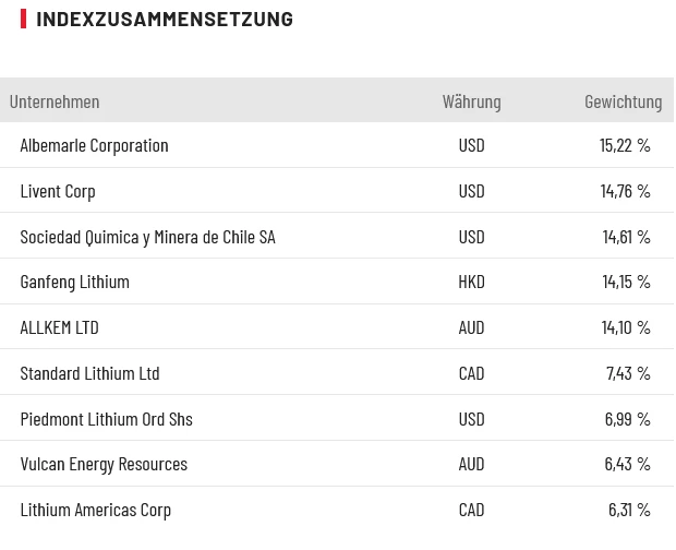 Trotz exzellenter Langfristaussichten birgt die Präsentation von Quartalszahlen stets das Risiko einer negativen Überraschung mit entsprechenden Kursausschlägen nach unten. Anleger, die dennoch auf die Chancen die Lithium-Sektors setzen wollen, greifen daher zu einem breiten Aktienkorb. Mit dem Indexzertifikat WKN DA0AAS können Anleger nahezu 1:1 an der Entwicklung des Index teilhaben.