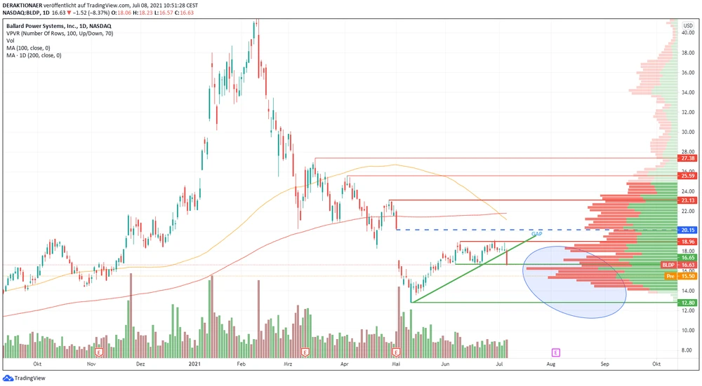 Die Lage bei Ballard Power und anderen Titeln aus dem H2-Sektor trübt sich aktuell ein. Die Aktie von Ballard Power notiert an einer wichtigen Marke und aktuell stützt das Volumen-Peak. Hält der Bereich um die 16 Dollar nicht, droht ein weiterer Abverkauf. Ein Neuanstieg drängt sich in der angespannten Lage aktuell nicht auf. Investierte Anleger bewahren Ruhe und beobachten die Lage.