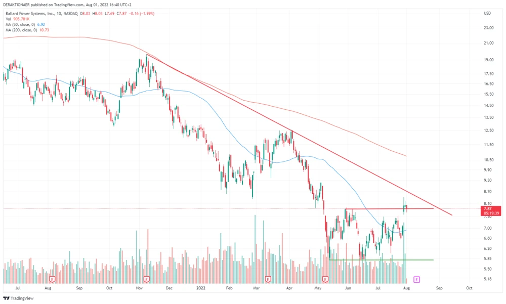 Der brachiale Abverkauf der Ballard-Power-Aktie fand im Mai zwar ein Ende. Seither konsolidiert sie aber auch lediglich in einer Seitwärtsrange und bildete dabei einen Boden an der Horizontalen bei 5,75 Dollar aus.