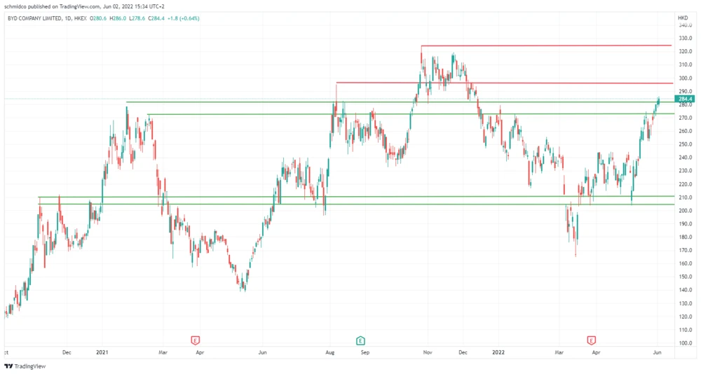 284,40 Hongkong-Dollar (HKD) – mit diesem Kurs endet der Tag in Hongkong für die BYD-Aktie. Damit liegt der Schlusskurs über den August-Hochs, die bei 282 HKD die obere Begrenzung einer hartnäckigen Widerstandszone markiert haben. Technisch gesehen hat die Aktie den Widerstand durchbrochen und ein starkes Kausignal generiert.
