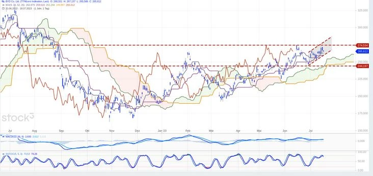 Aus charttechnischer Sicht rückt die Marke von 274,53 Hongkong-Dollar wieder in den Fokus. „Nach dem Halten der SKS-Nackenlinie bei 244,20 HKD konnte die Aktie von BYD eine spürbare Bestätigung des ursprünglichen Aufwärtsmodus einläuten. Dieser hatte seit Mitte März 2023 Bestand. Das Halten der SKS-Nackenlinie ist ein schönes Bestätigungssignal nach einer gesunden Konsolidierung“, sagt Charttechnik-Experte Martin Utschneider.