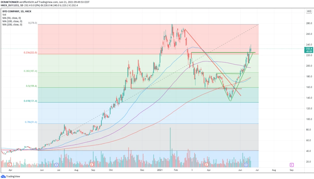 Satte 70 Prozent Gewinn stehen bei der BYD-Aktie seit Mitte Mai zu Buche. Die massiven Kursverluste, die aus der branchenweiten Korrektur zwischen Februar und Mai resultierten, sind damit nahezu wieder ausgeglichen. Nachdem der Wert Anfang Juni eine V-Formation aufgelöst hatte (DER AKTIONÄR berichtete), generierte er im Zuge seines Höhenflugs noch weitere Kaufsignale.