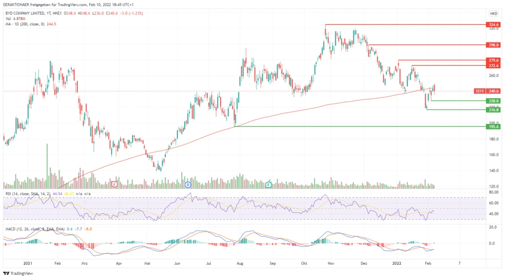 BYD hat viel Potenzial, da insbesondere die Elektroflitzer mit einer hohen Beliebtheit bei den Kunden punkten. Die Aktie bleibt aber vorerst nur etwas für risikofreudige Anleger. Mutige können auf eine nachhaltige Trendwende spekulieren, sobald der Titel den GD200 erneut überschreitet.