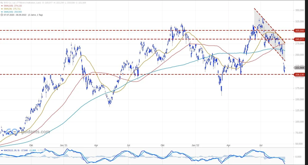 „Aktuell notiert das Papier von BYD bei rund 222 Hongkong-Dollar (HKD). Der seit dem 06.07.2022 eingeschlagene Abwärtstrend hat sich zuletzt nicht nur bestätigt, sondern sogar noch dynamisiert. Obere Trendlinie und der 38-Tage-Durchschnitt bei rund 285 HKD waren die vermuteten Hürden. Aktuell ist nun auch die 200-Tage-Linie (260 HKD) unterschritten. Das Exhausting-Gap vom 01.09.2022 zeigt, mit welcher Dynamik die Aktie aus ihrem Abwärtstrend nach unten herausgefallen ist. Trendfolge-Indikatoren wie MACD oder Ichimoku weisen auf eine mittelfristig weiterhin abwärts gerichtete Tendenz hin. Kurzfristindikatoren wie die Slow-Stochastik sind ebenfalls bestenfalls neutral. Daher liegt das primäre Augenmerk aktuell auf der Supportlinie bei rund 206 HKD. Diese könnte durchaus ein Wegweiser für die kurz- bis mittelfristige Entwicklung werden. Bei einem Unterschreiten käme dem Support bei 191 HKD sehr große Bedeutung zu. Hält die 206´er-Supportlinie ist allerdings bei rund 240 HKD schon wieder der „Deckel drauf““, sagt Charttechnik-Spezialist Martin Utschneider von Donner & Reuschel.