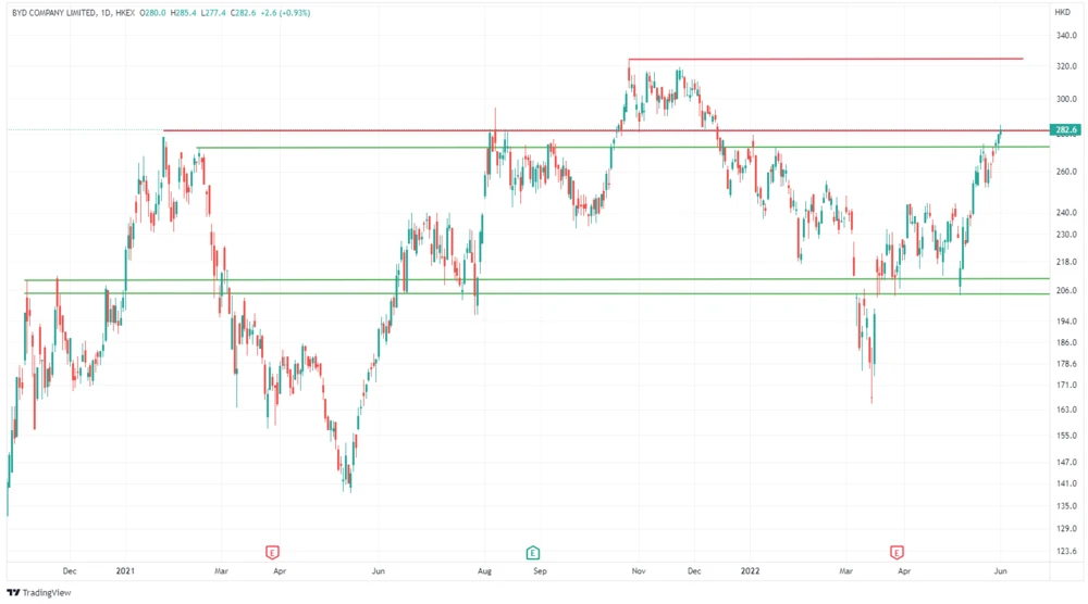Für die BYD-Aktie kommt die Nachricht genau zur richtigen Zeit. Der Titel kämpft gerade mit der Widerstandszone zwischen 273 und 282 Hongkong-Dollar (HKD). Im Tagesverlauf kletterte der Kurs bereits bis auf 285,40 HKD. Schließt er auch über dem Widerstand, wäre das ein deutliches Kaufsignal.