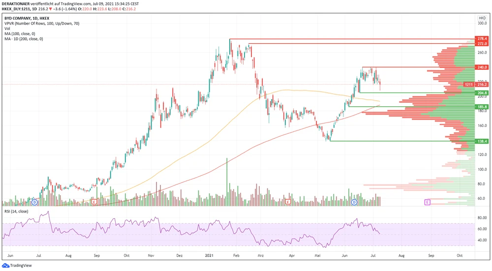 Die Papiere von BYD hatten zunächst einen schwachen Jahresstart und von dem Hoch im Januar verlor die Aktie zwischenzeitlich 50 Prozent an Wert. Ein Mehrmonatstief wurde Mitte Mai bei 138 Hongkong-Dollar (HKD) ausgebildet. Von diesem Punkt aus startete der Titel einen kraftvollen Rebound. Ohne nennenswerte Konsolidierung stieg der Kurs um 73 Prozent und erreichte am 21. Juni ein neues Mehrmonatshoch bei 240 HKD.