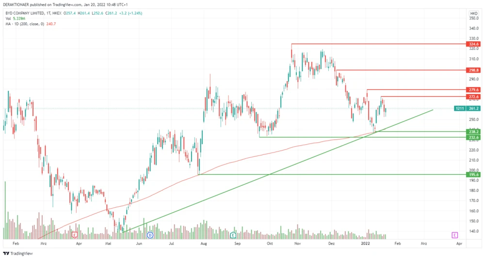 Seit November befindet sich die BYD-Aktie in einer Korrektur. In der vergangenen Woche setzte der Titel punktgenau auf der 200-Tage-Line bei 240 Hongkong-Dollar (HKD) auf. Im Anschluss starteten die Bullen einen Gegenangriff und der Kurs legte um rund 15 Prozent zu.