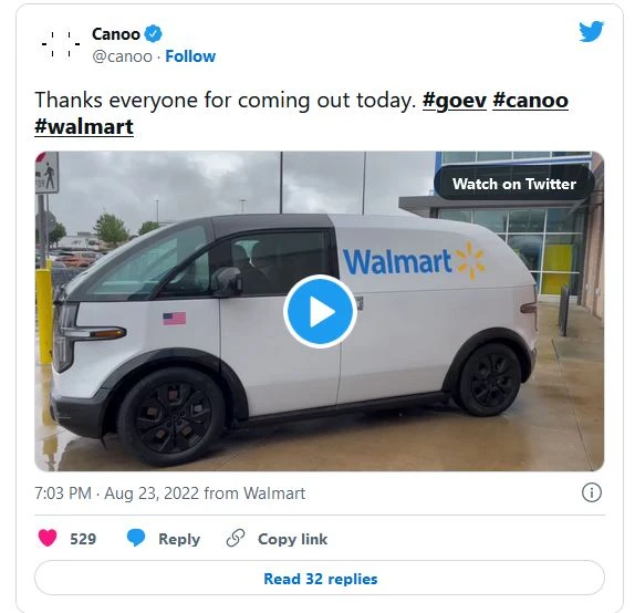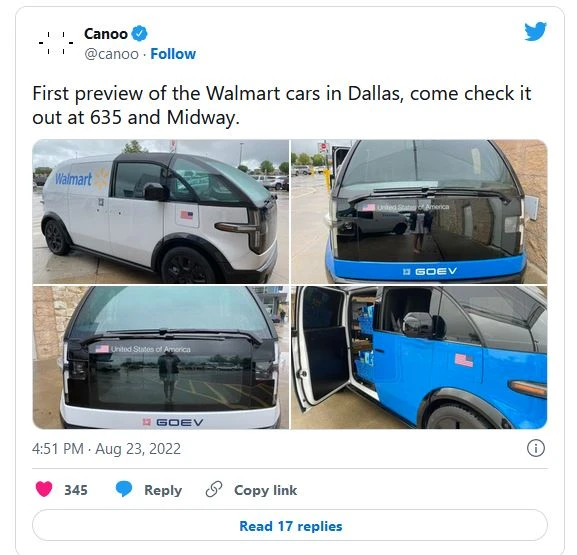 "Es war großartig, mit dem sehr erfahrenen Team von Walmart zusammenzuarbeiten, um unsere LDVs schnell in realen Anwendungsfällen einzusetzen und eine Konfiguration für Walmart zu erstellen“, sagte Canoo-Chef Tony Aquila.