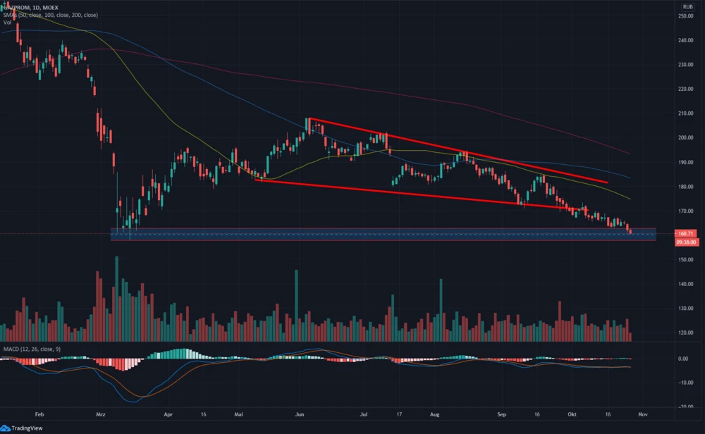 Zum Monatsbeginn durchbrach der Kurs die untere Begrenzungslinie der mittelfristigen Keil-Formation bei 170 Rubel. Seitdem setzte der Wert weiter zurück und steht jetzt in der Unterstützungszone zwischen 158,17 und 163,00 Rubel.