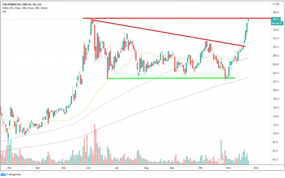 Die ITM-Power-Aktie legt gerade einen steilen Höhenflug hin. Innerhalb der letzten drei Wochen stieg sie um über 60 Prozent an und beendete dabei ihre Konsolidierungsphase. Diese ging vom Allzeithoch vom Juni bei 367 Pence aus. Von dort aus bewegte sich der Kurs in Form eines Dreiecks.