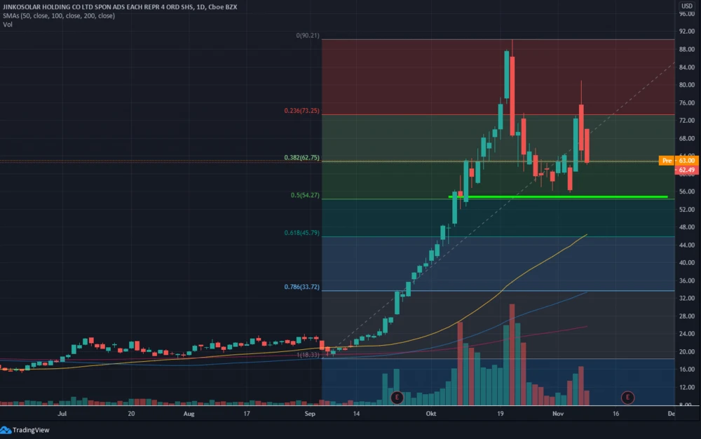 Nach dem steilen Höhenflug von September bis Ende Oktober, folgte bei der JinkoSolar-Aktie eine Korrekturphase. Der Wert fiel dabei von seinem Allzeithoch bei 90,20 Dollar bis knapp über die Unterstützung bei 55 Dollar. An dieser Marke kam es am vergangenen Mittwoch aber zu einem Rebound, sodass der Wert kurzzeitig sogar das 23,6%-Fibonacci-Retracement bei 73,25 Dollar überschreiten konnte. Kurz darauf folgten erneut Gewinnmitnahmen, wodurch der Kurs gestern bis an das 38,2%-Fibonacci-Retracement bei 62,75 Dollar zurücksetzte.