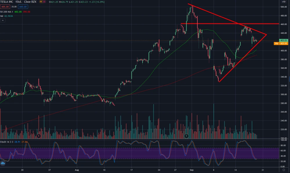 Im kurzfristigen Chart bildet die Tesla-Aktie seit dem Allzeithoch bei 502,41 Dollar eine symmetrische Dreiecksformation aus. Noch am heutigen Handelstag läuft der Kurs in die Spitze dieser Formation und dürfte in eine Richtung auszubrechen.