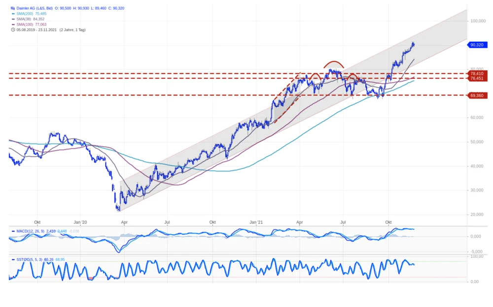 In den letzten Wochen und Monaten haben die Analysten in schöner Regelmäßigkeit ihre Kursziele für die Daimler-Aktie nach oben revidiert. Vor wenigen Tagen knackte das Papier sogar die 90-Euro-Marke. Geht es nach Berenberg-Analyst Arndt Ellinghorst, so ist das Potenzial für die Aktie noch immer nicht ausgeschöpft. Sein Kursziel lautet 116 Euro. „Aus charttechnischer Sicht sind mittelfristig Kurse um die 95 Euro möglich. Die Trendfolgesystematik zeigt sich weiterhin intakt“, sagt Charttechnik-Spezialist Martin Utschneider von Donner & Reuschel.