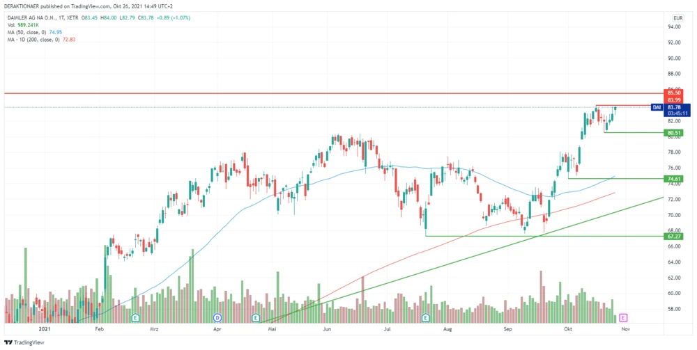 Aktuell scheinen die meisten Anleger optimistisch gestimmt zu sein. Die Aktie von Daimler nimmt weiter Fahrt auf und steht kurz vor dem Ausbruch über den Widerstand bei 84 Euro. Alleine in den vergangen vier Wochen verteuerte sich der Preis pro Anteilsschein um über 22 Prozent.
